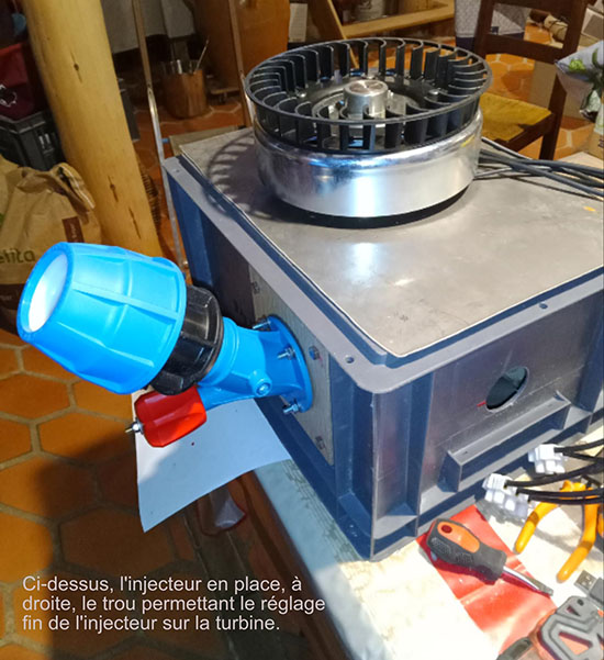 La réalisation d'une micro centrale hydraulique passe par la fixation de la génératrice ME1112 et de sa turbine PELTON PCD160 sur une "boîte à eau maison" afin de positionner correctement l'injecteur variable.