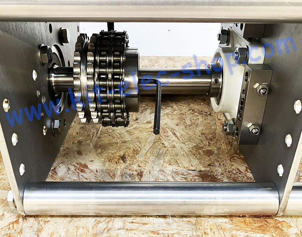 The motor plate from the second transmission support can then be reinstalled and the 30 mm stainless steel shaft pushed into place on the bearing housing shaft.