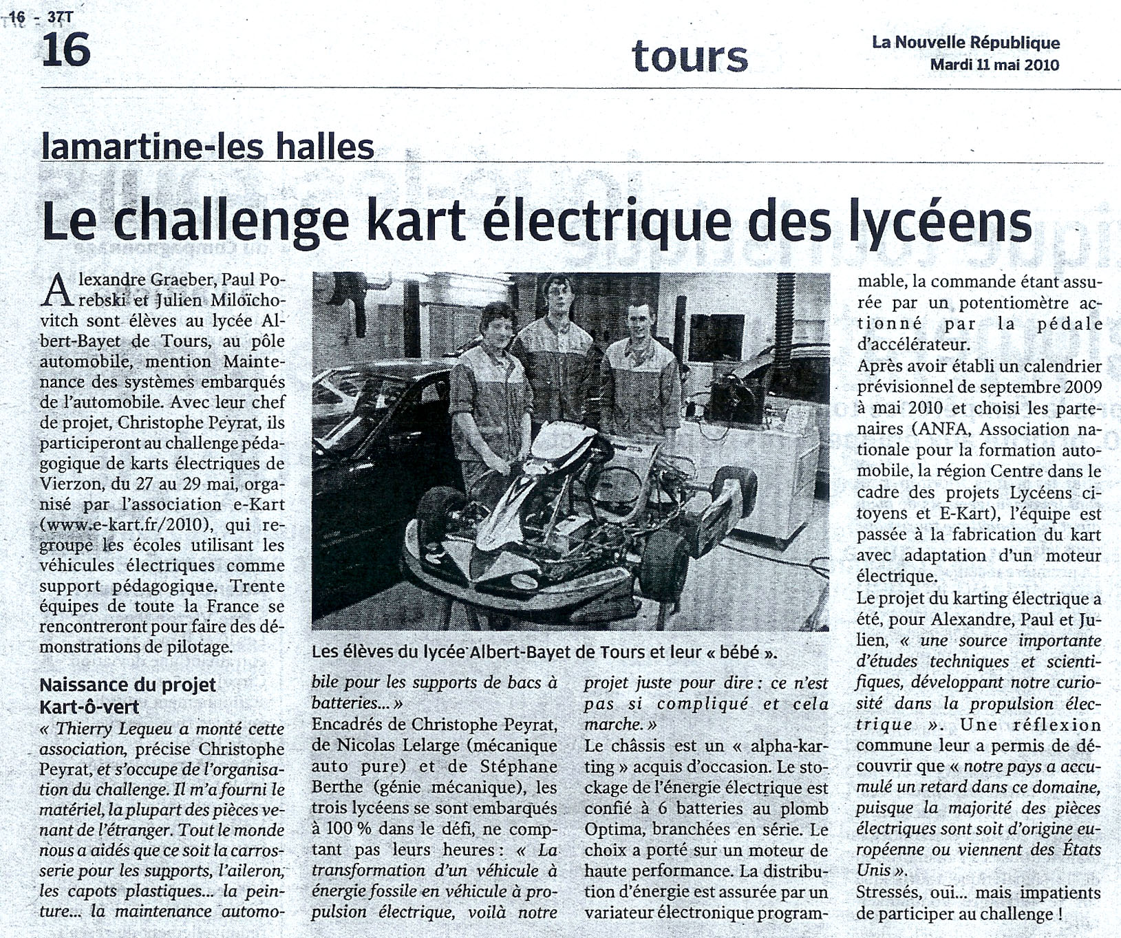 Alexandre Graeber, Paul Porebski et Julien Miloïchovitch sont élèves au lycée Albert-Bayet de Tours, au pôle automobile, mention Maintenance des systèmes embarqués de l'automobile. Avec leur chef de projet, Christophe Peyrat, ils participeront au challenge pédagogique de karts électriques de Vierzon, du 27 au 29 mai, organisé par l'association e-Kart (www.e-kart.fr/2010), qui regroupe les écoles utilisant les véhicules électriques comme support pédagogique. Trente équipes de toute la France se rencontreront pour faire des démonstrations de pilotage.