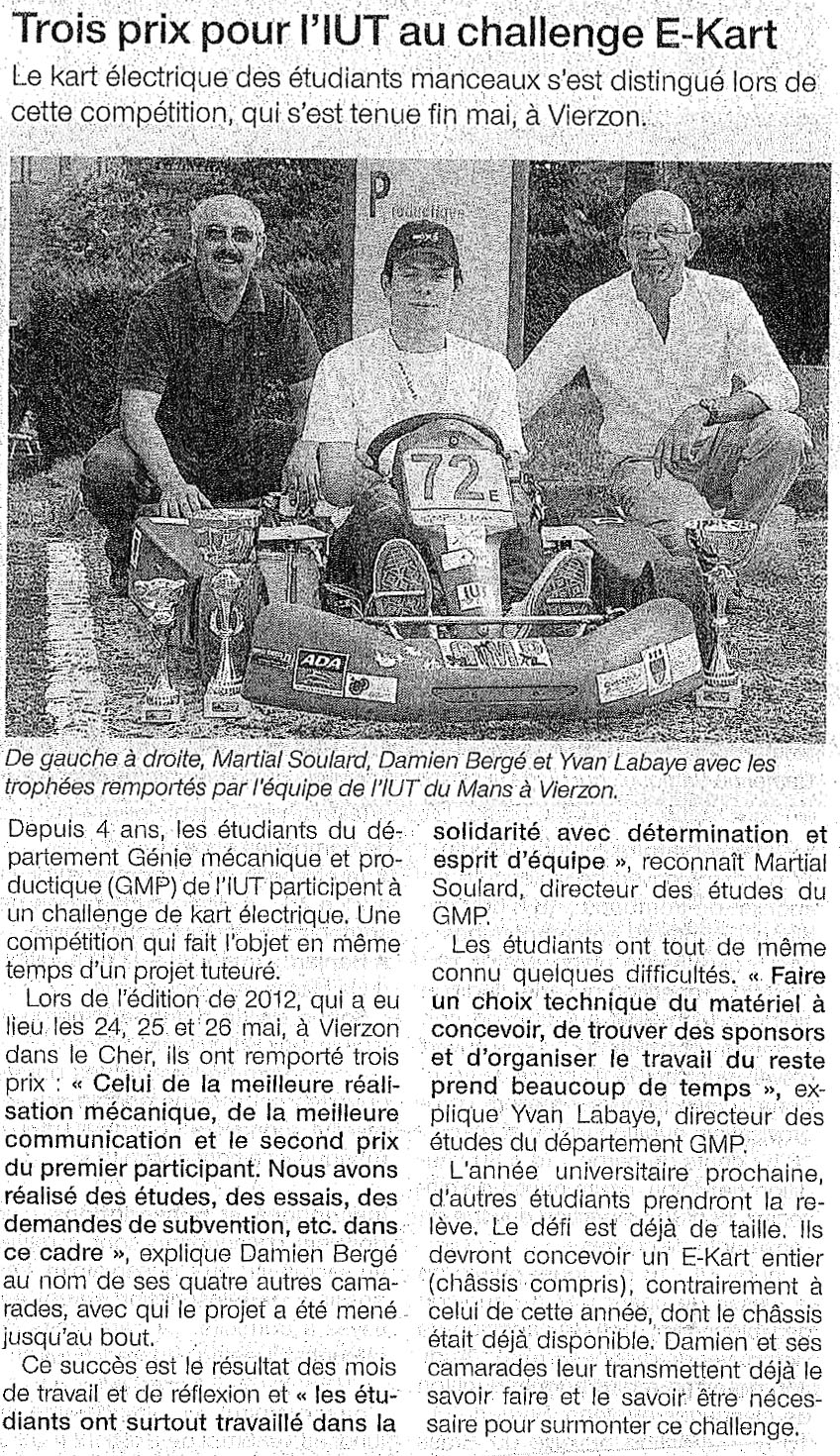 Lors de l'édition de 2012, qui a eu lieu les 24, 25 et 26 mai, à Vierzon dans le Cher, ils ont remporté trois prix : « Celui de la meilleure réalisation mécanique, de la meilleure communication et le second prix du premier participant. Nous avons réalisé des études, des essais, des demandes de subvention, etc. dans ce cadre », explique Damien Bergé au nom de ses quatre autres camarades, avec qui le projet a été mené jusqu'au bout.