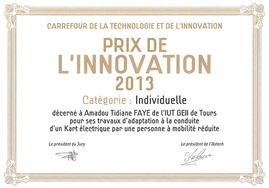 Lors du Carrefour de la Technologie et de l'Innovation de Vierzon 20123, Amadou FAYE a remporté le Prix de l'Innovation 2013 dans la catégorie individuelle pour son projet d'adaptation de la conduite d'un kart électrique via un joystick à destination des personnes à mobilité réduite.
