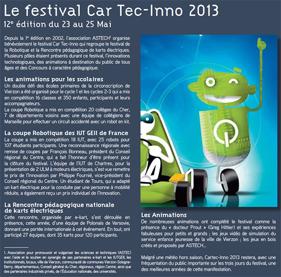Depuis la 1e édition en 2002, l’association ASTECH(1) organise bénévolement le festival Car Tec-Inno qui regroupe le festival de la Robotique et la Rencontre pédagogique de karts électriques.