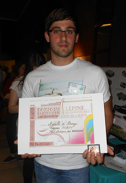 En ce dimanche 1er juin 2014, Benjamin ROBIN remporte le 2ième Prix Sénior Individuel, la médaille de Bronze du concours Lépine de Paris et 200 euros de la Ville de Monts, à l'occasion de ce 18ième Salon des Jeunes Inventeurs et Créateurs de Monts en Touraine.